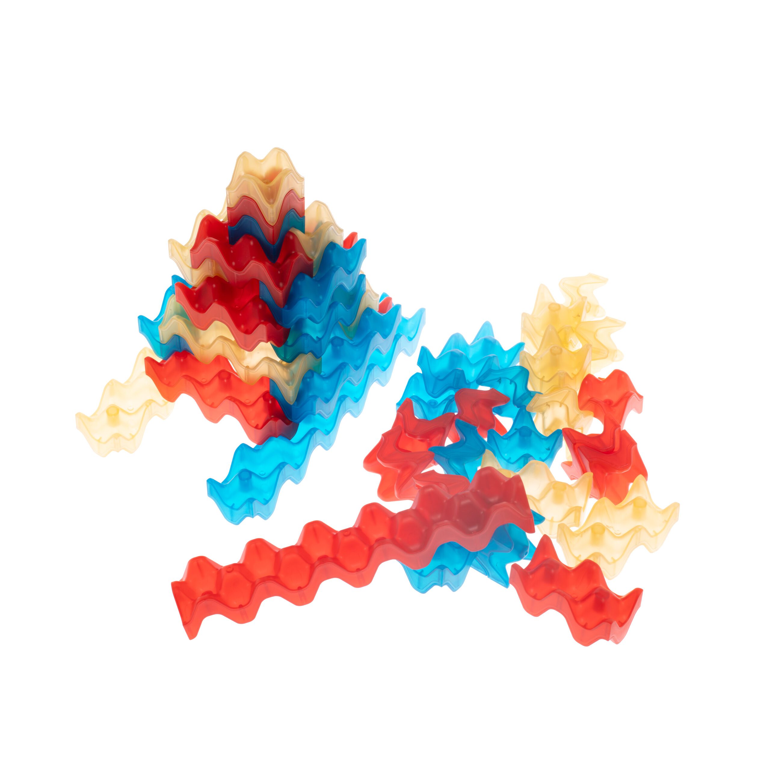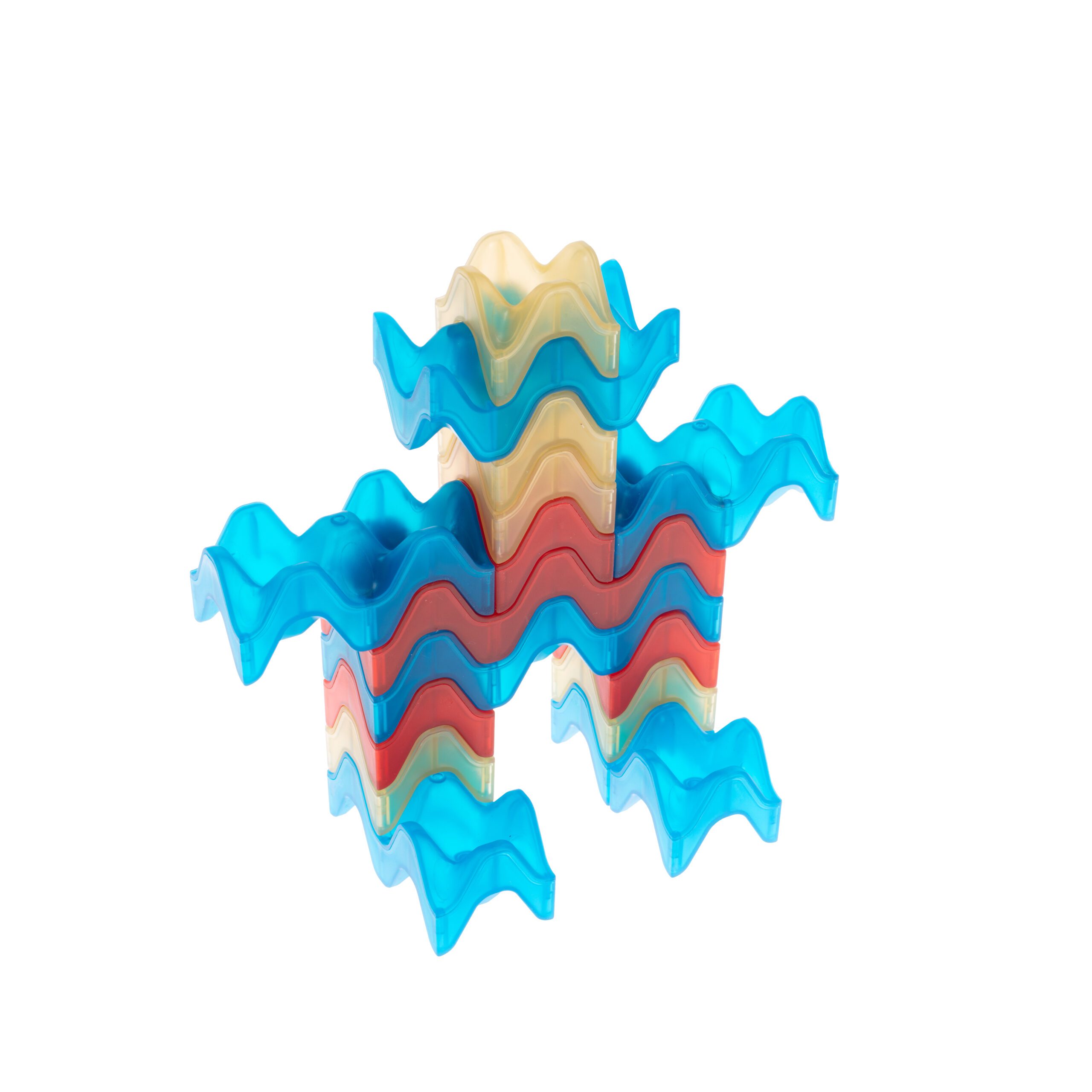 Wave shaped TRANSLUCENT construction block set for children composed of 45 pcs in 4 colours. These uniquely designed blocks inspire creativity and innovation, perfect for using with LED light tables, allowing young builders to explore endless possibilities. The wave shapes interlock seamlessly, encouraging problem solving skills and imaginative play.