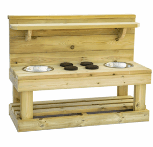 | The Triple Trouble Mud Kitchen is an expanded and versatile kitchen that offers an extensive and engaging platform for immersive sensory play. With its dual bowls and added hob feature, this mud kitchen provides young learners with an enhanced and dynamic space to engage in imaginative cooking scenarios, tactile exploration, and collaborative fun. The larger size and expanded features of the Triple Trouble Mud Kitchen offer additional play opportunities, fostering creativity, social interaction, and multi sensory learning experiences for children.. Measuring – L1200 x D600 x H450mm (worktop) Total height 900mm. |