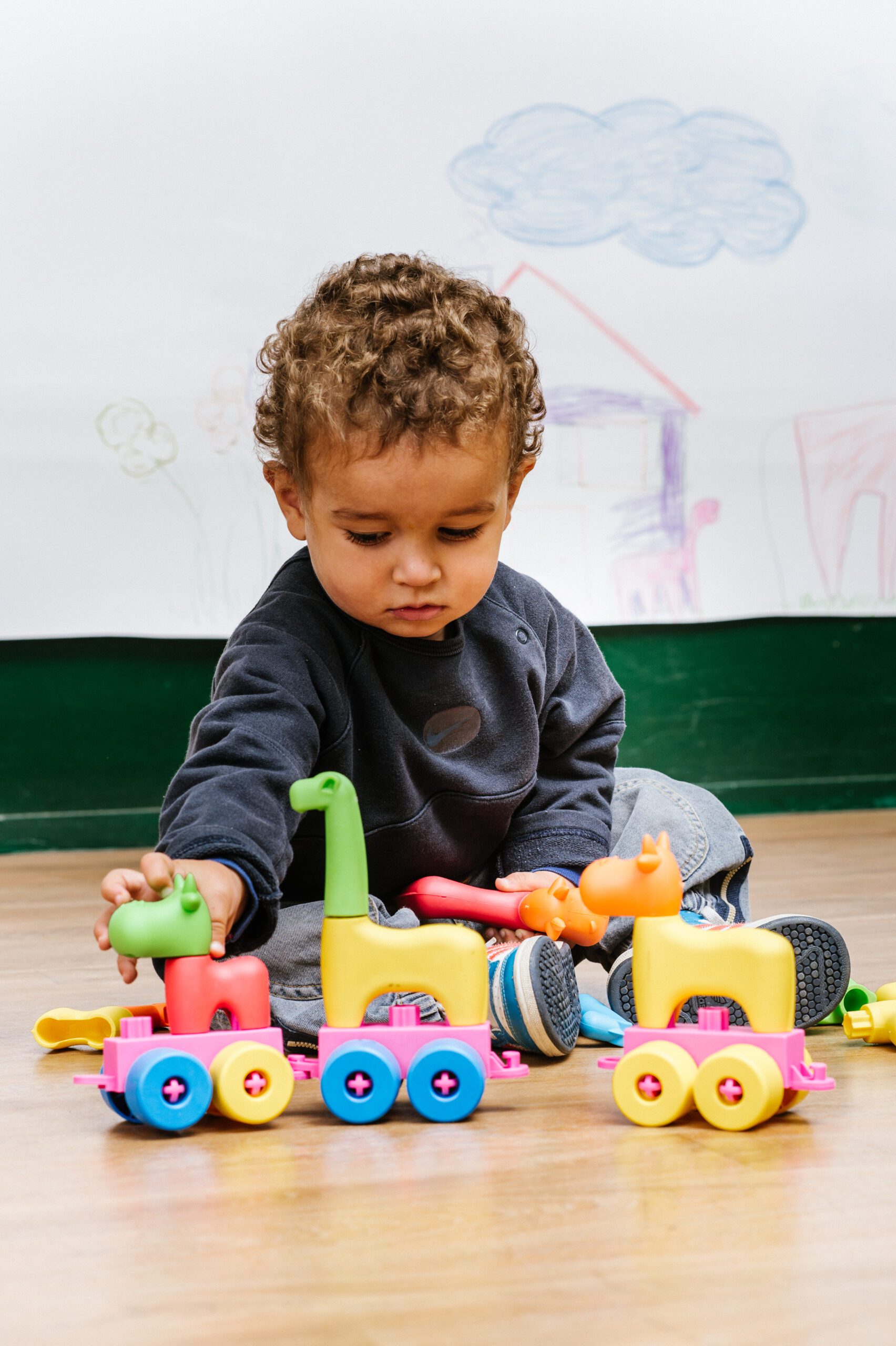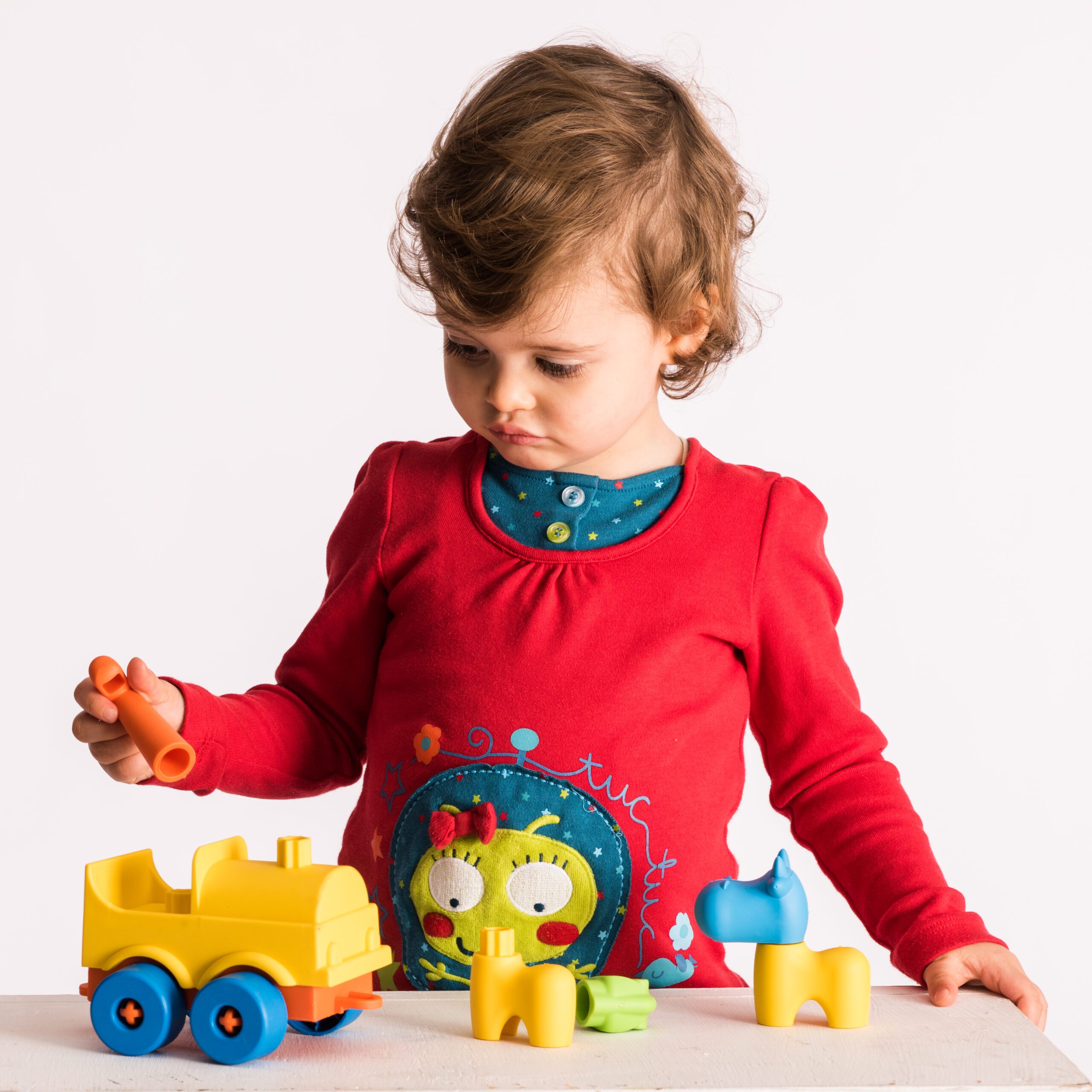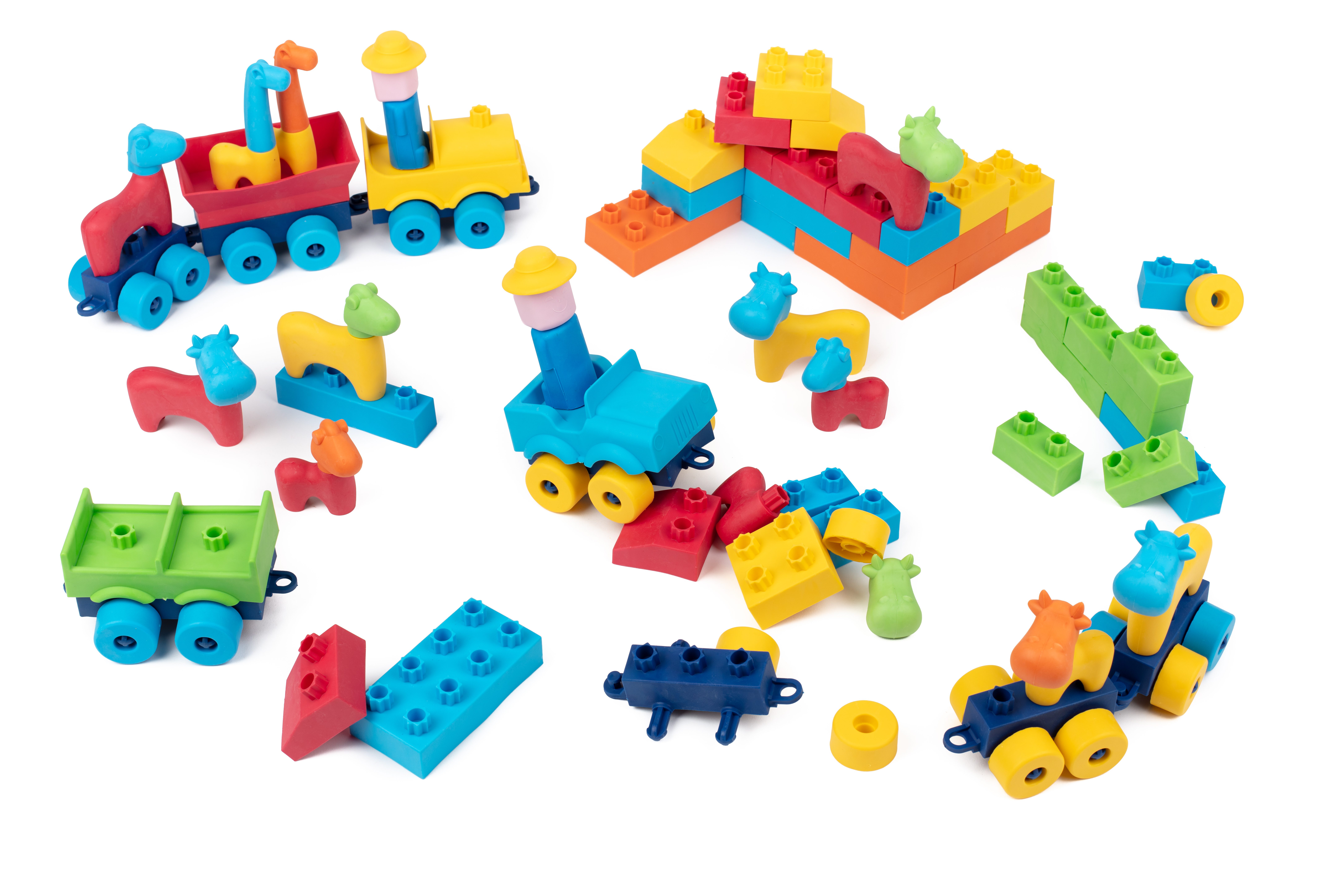 A complete set of plastic construction made of soft material, very easy to manipulate, perfect for small hands. 106 pc set in different shapes & colours, light & washable, including people, animals, wheels & vehicles. Wheel diameter 4cm, vehicle length to 13cm